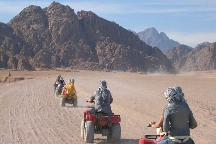 Explore the Magic of Red Sea Desert by Quad bike tour from Hurghada. Relax, drink Bedouin tea, and experience the Bedouin lifestyle before heading back through the sand dunes to the starting point.