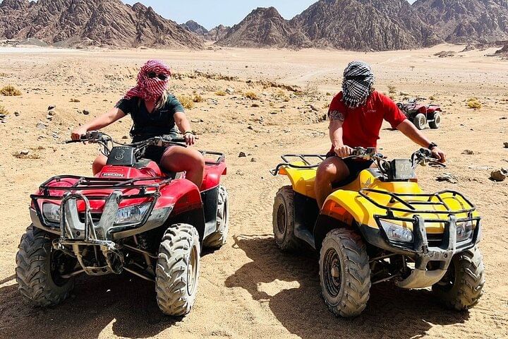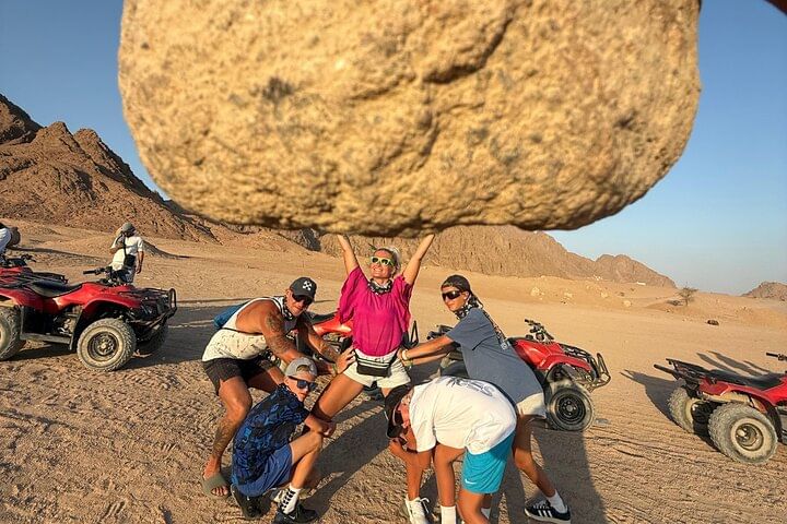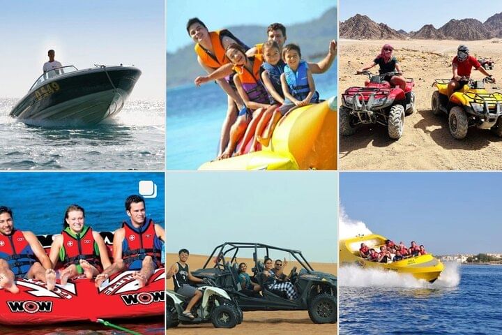 Embark on an exhilarating Mega BOOM Safari that combines the thrill of a 60-minute quad bike ride, a serene 10-minute camel ride, and a delightful Bedouin tea experience. Then, soar high with parasailing, ride the waves on a banana boat and tube boat, and feel the adrenaline rush on a speed boat. Conclude the day with a delectable beachside lunch, making this excursion an unforgettable experience for adventure seekers. Book now for an action-packed day filled with excitement and relaxation amidst the stunning landscapes of Sharm El Sheikh!