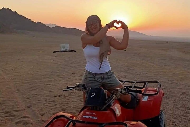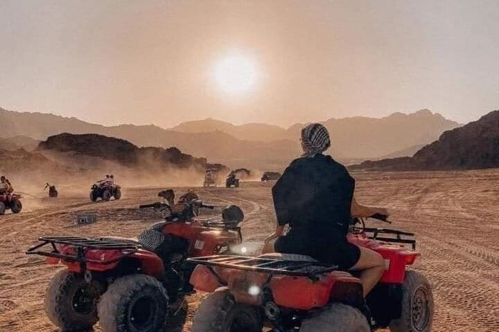 Enjoy a sunset desert safari from Sharm El Sheikh with hotel pickup, an ATV quad bike ride across the Sinai Desert, a short camel ride, Bedouin tea, BBQ dinner, and live entertainment including belly dance and fire show. This shared evening trip combines adventure, desert scenery, local atmosphere, and traditional entertainment in one well-organized experience.
